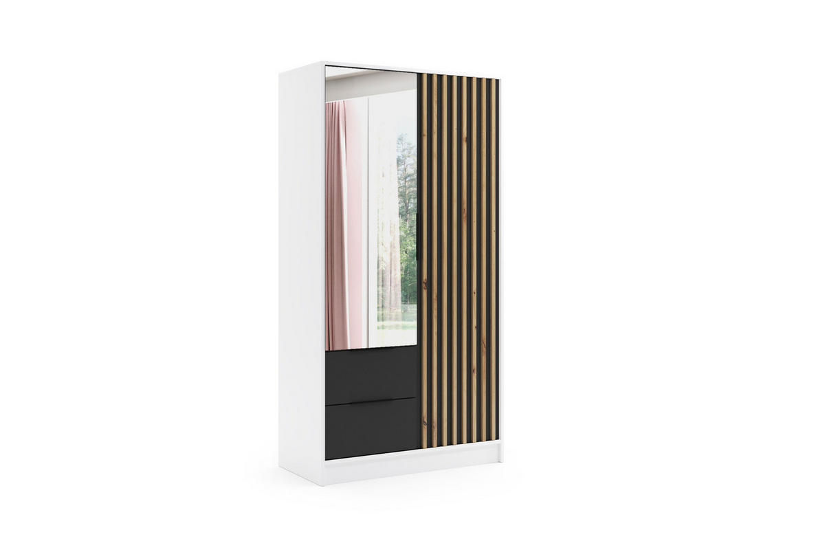 Drehtürenschrank ist ein Klassiker der Funktionalität – mit Flügeltüren, vollem Zugang zum Innenraum und einfacher, übersichtlicher Organisation.Fronten mit Lamellen verleihen dem Innenraum einen modernen, dekorativen Charakter, bringen Leichtigkeit in die Gestaltung und betonen stilvoll den Kleiderschrank.Die Kombination aus verschiedenen Fächern und Kleiderstangen garantiert im Garderobenschrank ausreichend Platz und Stauraum für Kleidung und sorgt für Ordnung im Schlafzimmer.Hochwertige, langlebige Materialien sorgen für stabile Verarbeitung, lange Nutzungsdauer des Schlafzimmerschranks und bewahren sein elegantes Erscheinungsbild über viele Jahre.Der Spiegel im Schrank vergrößert den Raum optisch, sorgt für mehr Helligkeit und erhöht die Funktionalität, da er ein bequemes Betrachten der täglichen Outfits ermöglicht.Eleganter Schiebetürenschrank – moderner Minimalismus für Ihr ZuhauseDieser moderne Schrank wurde für Liebhaber von Schlichtheit, Eleganz und funktionalen Lösungen entworfen. Seine perfekten Fronten bilden eine harmonische, minimalistische Fläche, wodurch er sich sowohl in moderne als auch in klassische Raumgestaltungen ideal einfügt. Das außergewöhnliche Design verleiht ihm Leichtigkeit sowie ein klares, zeitloses Erscheinungsbild.Der Schrank ist mit Schiebetüren ausgestattet, die in jedem Raum Platz sparen. Diese komfortable, ästhetische und äußerst praktische Lösung sorgt für eine leise und sanfte Bewegung der Fronten und unterstreicht zugleich den minimalistischen Charakter des Möbels. Der Innenraum des Schranks wurde so gestaltet, dass er die Ordnung erleichtert. Zahlreiche Einlegeböden und Kleiderstangen ermöglichen eine übersichtliche Organisation der Garderobe und eine optimale Nutzung des verfügbaren Platzes. Der Schrank wurde aus langlebigen, pflegeleichten Materialien gefertigt, sodass er über viele Jahre hinweg sein ansprechendes Aussehen behält. Die beigefügte, verständliche Montageanleitung macht den Aufbau schnell und unkompliziert.Die große Vielfalt unseres Angebots ermöglicht es, den Schrank perfekt an jeden Raum anzupassen – ob Schlafzimmer, Ankleidezimmer, Flur oder Jugendzimmer.Setzen Sie auf Ästhetik, Benutzerkomfort und moderne Technologien – wählen Sie einen Schiebetürenschrank, der Ihr Interieur verwandelt.