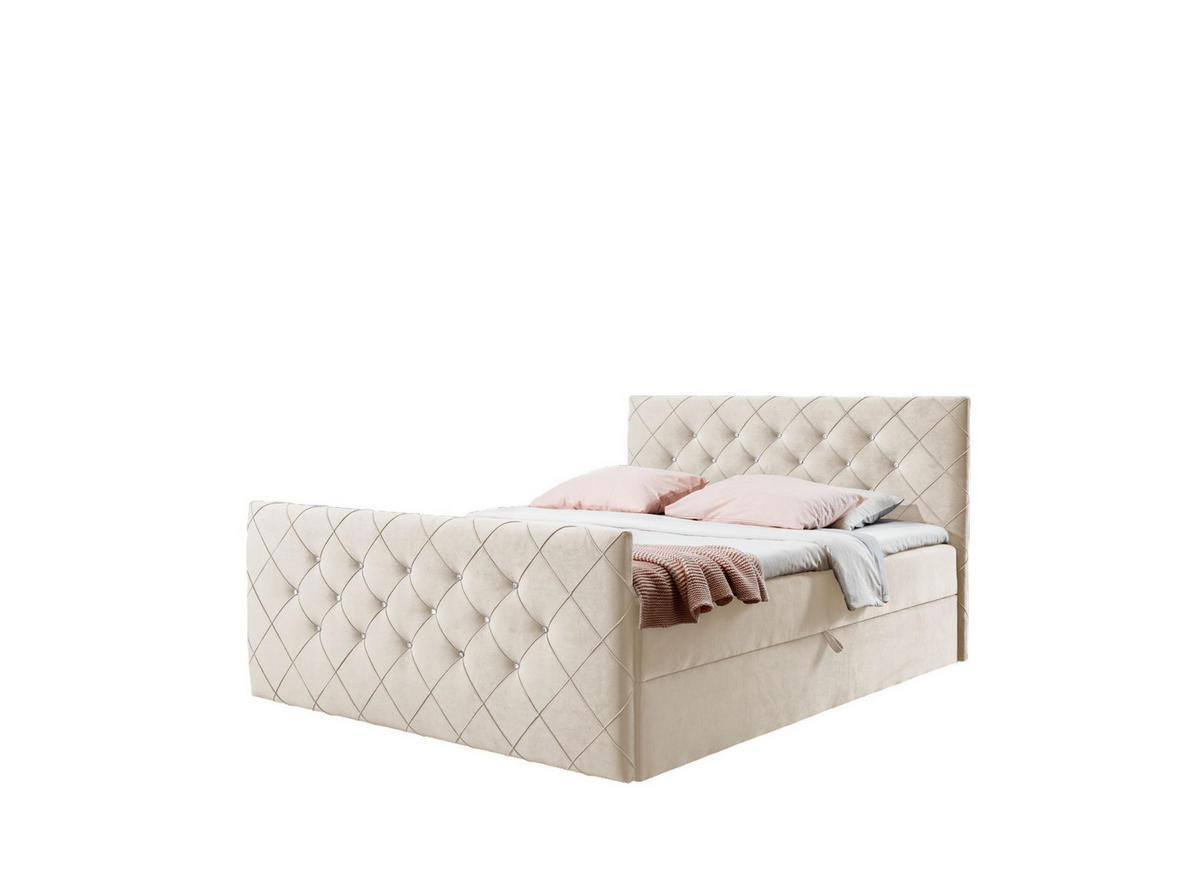 Boxspringbett MALAGA im eleganten Design. Eine besondere Optik erhält das Polsterbett durch das wunderschöne Kopf- und Fußteil, das mit einer eleganten Steppnaht und Steinen verziert ist. Das Bett ist mit einer Bonnellfederkernmatratze ausgestattet, die für einen hohen Schlafkomfort sorgt. Eine bequeme 5 cm dicke Kaltschaumauflage passt sich dem Rücken optimal an und entlastet die Wirbelsäule. Die beiden integrierten Bettkästen bieten viel Stauraum.