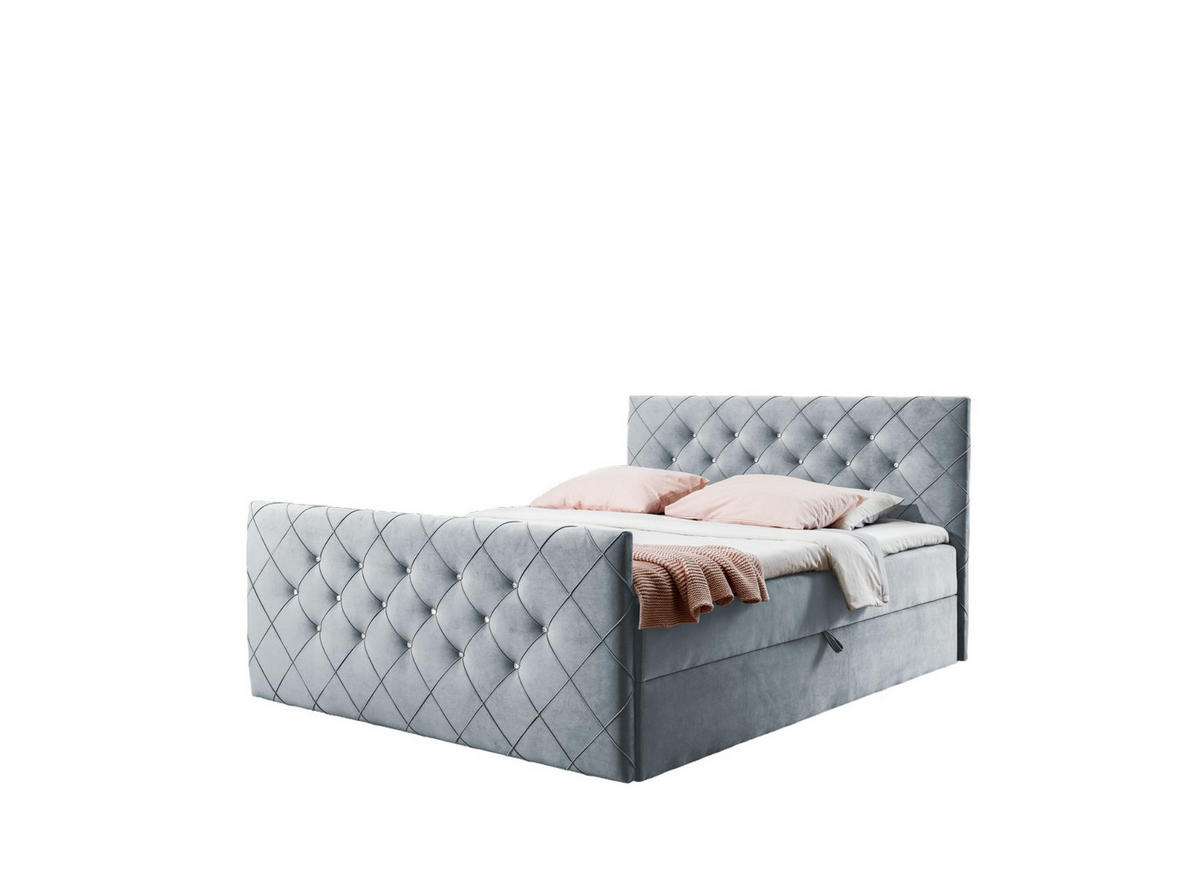 Boxspringbett MALAGA im eleganten Design. Eine besondere Optik erhält das Polsterbett durch das wunderschöne Kopf- und Fußteil, das mit einer eleganten Steppnaht und Steinen verziert ist. Das Bett ist mit einer Bonnellfederkernmatratze ausgestattet, die für einen hohen Schlafkomfort sorgt. Eine bequeme 5 cm dicke Kaltschaumauflage passt sich dem Rücken optimal an und entlastet die Wirbelsäule. Die beiden integrierten Bettkästen bieten viel Stauraum.