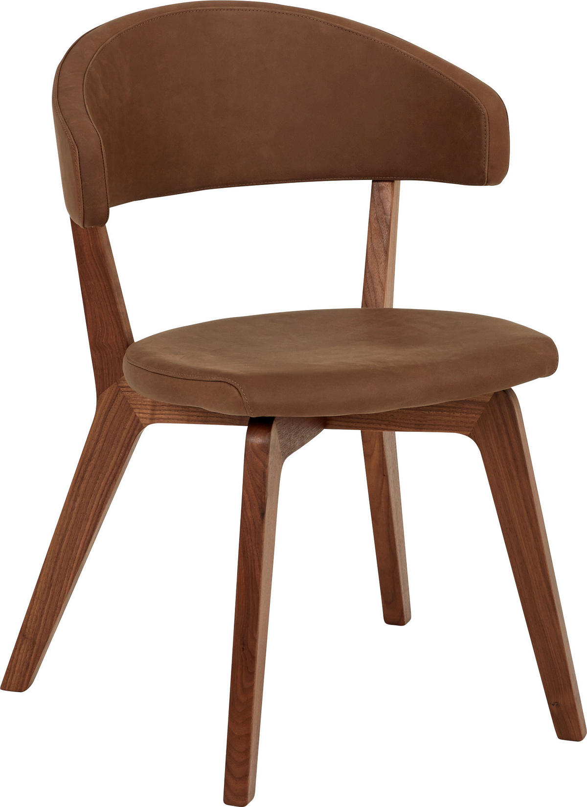 Der Stuhl steht auf einem Holzgestell aus hochwertigem Astnuss-Massivholz. Das verleiht ihm ein hohes Maß an Stabilität und eine Aura, die voller Natürlichkeit glänzt. Der Echtlederbezug fügt sich in dieses Designkonzept ideal ein. Das feine Nubukleder zeichnet sich besonders durch seine samtartige Oberfläche aus, die von Kalbs- und Rindshäuten stammt. So erhalten Sie einen wertvollen Polsterbezug, der garantiert langlebig ist.