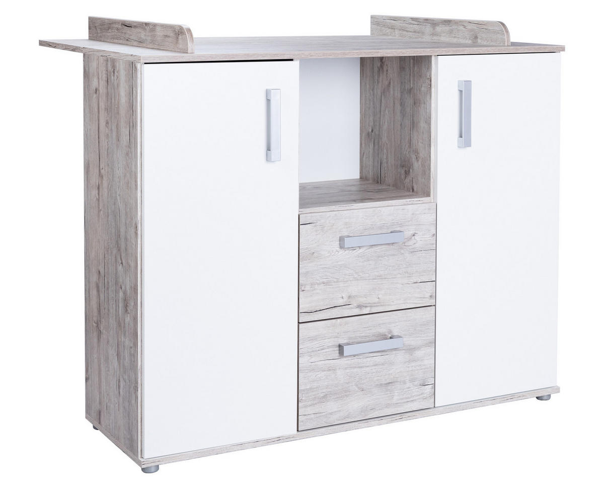 Die extra geräumige Wickelkommode Bente von arthur berndt bietet jede Menge strukturierten Stauraum, in dem die Garderobe deines Sprösslings, Hygieneartikel und vieles mehr bequem untergebracht werden können. Zudem kann die Wickelkommode dank des abnehmbaren Wickelaufsatzes nach der Wickelzeit als normale Kommode weiter verwendet werden. Besonders attraktiv ist die Optik in Eiche Sand-Nachbildung und Absetzungen in Weiß. Dadurch wird Bente zum besonderen Hingucker und es entsteht sofort eine gemütliche Wohlfühlatmosphäre.