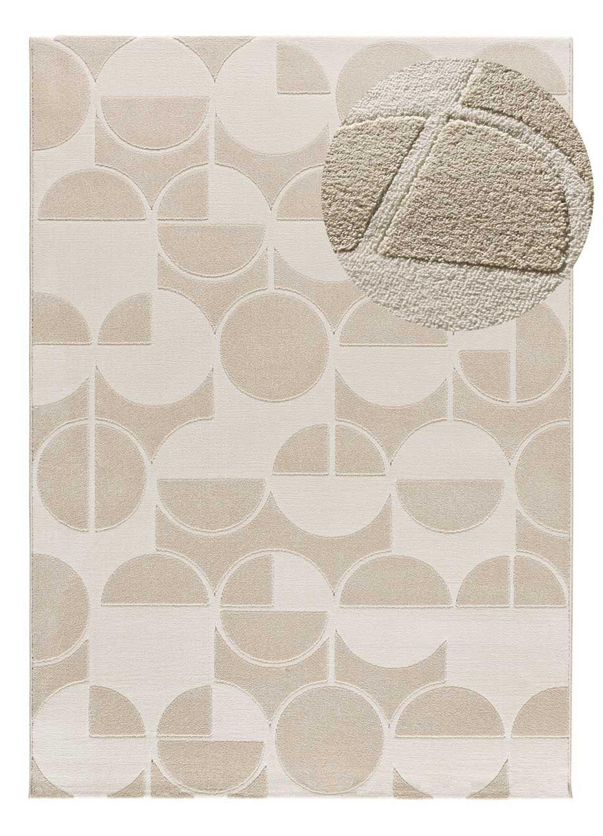 Wir stellen Ihnen den neuen geometrischen Teppich mit Relief FLORA vor. Entdecken Sie die geraden und ovalen geometrischen Formen, die ineinander übergehen, um Ihrem Zuhause einen modernen Touch zu verleihen, perfekt als Wohn- oder Schlafzimmerteppich. Seine neutralen Töne mit einem leichten Hauch von Farbe bringen Licht in Ihr Zuhause, überlegen Sie nicht lange!