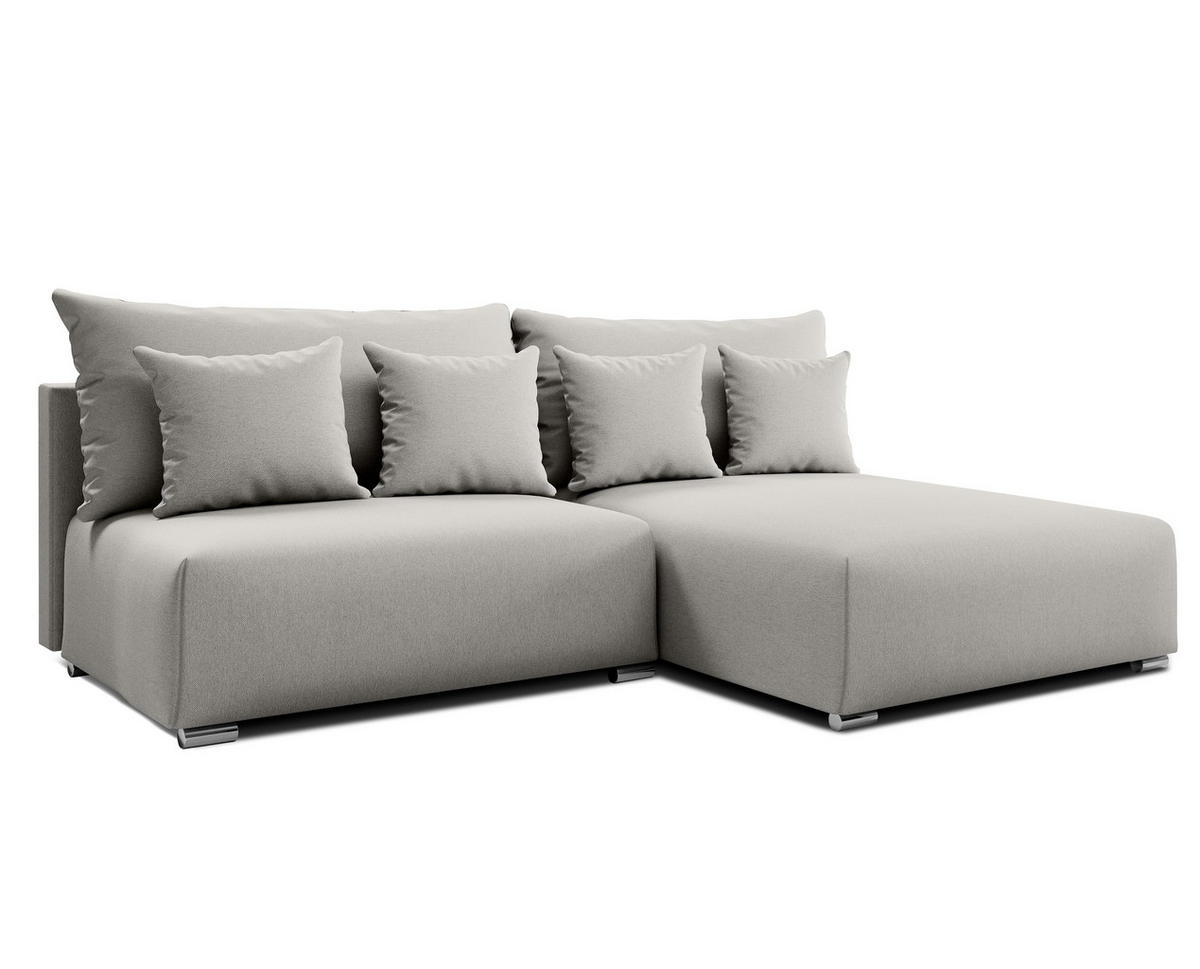 Das Ecksofa mit Schlaffunktion Ederra in stilvollem Hellgrau ist die perfekte Wahl für moderne, kompakte Wohnräume, die Funktionalität und Ästhetik vereinen möchten.