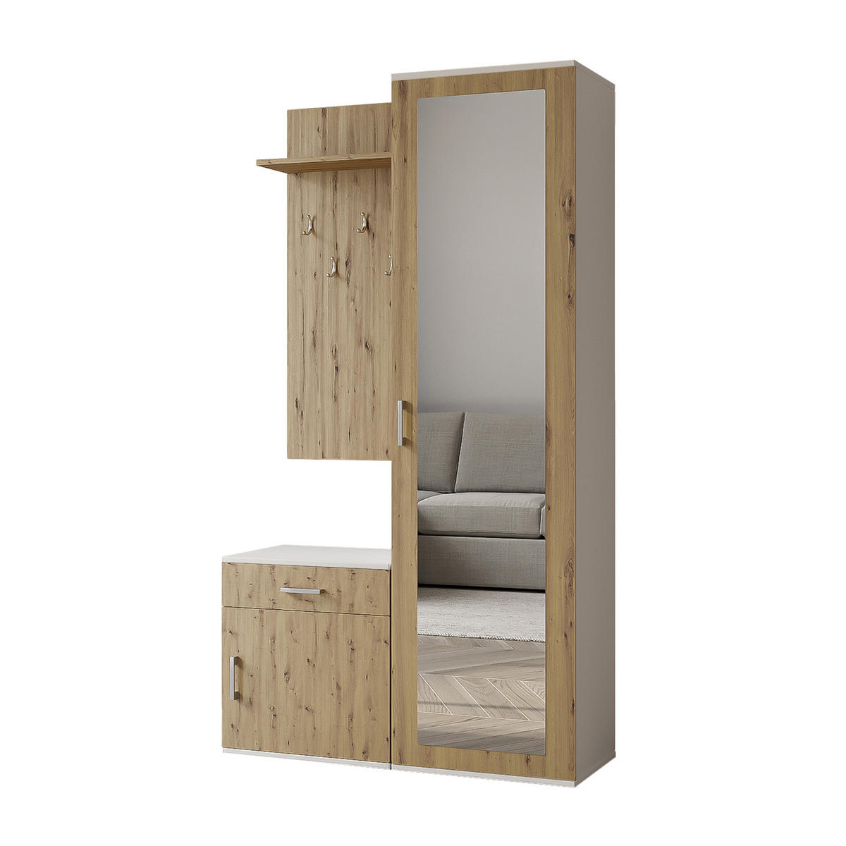 Die Garderobe mit Spiegel Magnola vereint modernes Design mit hoher Funktionalität. Mit einer Breite von 100 cm bietet sie viel Stauraum und ist eine ideale Lösung für kleine Flure. Die elegante Kombination aus weißem Korpus und Artisan-Eiche Fronten schafft eine stilvolle Atmosphäre in Ihrem Eingangsbereich.