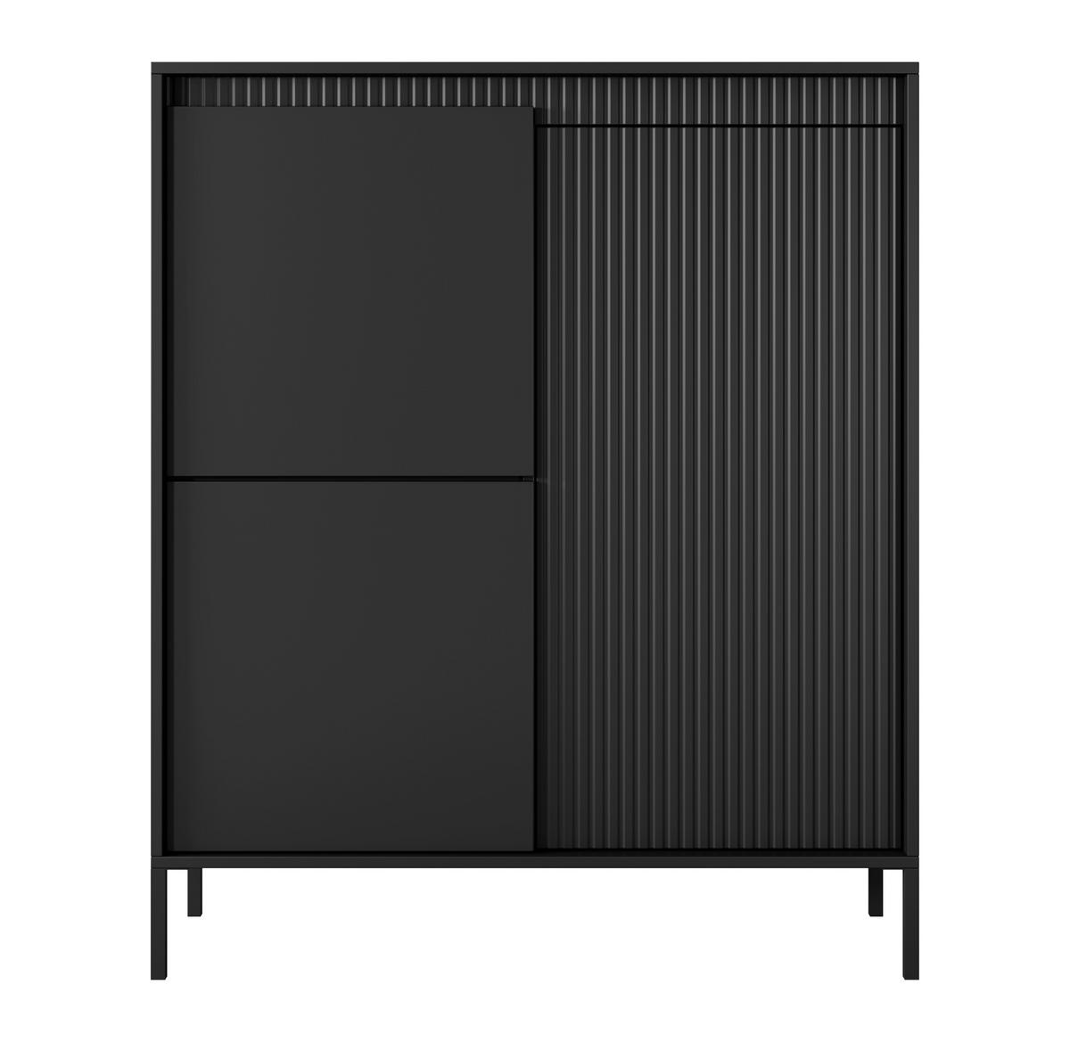 Das schwarze Highboard Trentinis 3D ist die perfekte Wahl für Liebhaber modernerund eleganter Designs. Die hohe Kommode passt ideal in jedes Wohnzimmer, Bürooder Schlafzimmer und bietet großzügigen Stauraum.Die Kombination aus geriffelten MDF-Fronten, glatten, leicht hervorgehobenenFlächen und schwarzen Metallbeinen verleiht diesem hohen Sideboard einunverwechselbares Aussehen. Das Push-to-Open-System sorgt für eine einfacheund griff freie Bedienung, die die minimalistische Ästhetik unterstreicht. Dietiefschwarze Farbe und die hochwertige Verarbeitung machen es zu einem Blickfangin jedem Raum.Hinter den Türen befinden sich sieben durchdachte Fächer, die ideal für Bücher,Geschirr oder Dekoration geeignet sind. Robuste und langlebige Materialien wieABS-Kanten, MDF-Fronten und stabile Metallbeine garantieren Stabilität. Dasschwarze Highboard ist zudem pflegeleicht und einfach zu montieren.• Optimale Maße: Breite: 103,5 cm, Höhe: 123,4 cm, Tiefe: 39,5 cm.• Hohe Kommode mit Push-to-Open-System.• Robuste Konstruktion aus MDF, HDF und Metall.• Pflegeleichte und hochwertige Materialien.• Einfache Montage: Lieferung in 2 Pakete, inkl. Montagematerial & Anleitung.Das schwarze Highboard Trentinis 3D ist die perfekte Verbindung aus Funktionalität,modernem Design und Eleganz. Ein unverzichtbares Möbelstück für stilvolle undpraktische Wohnräume.
