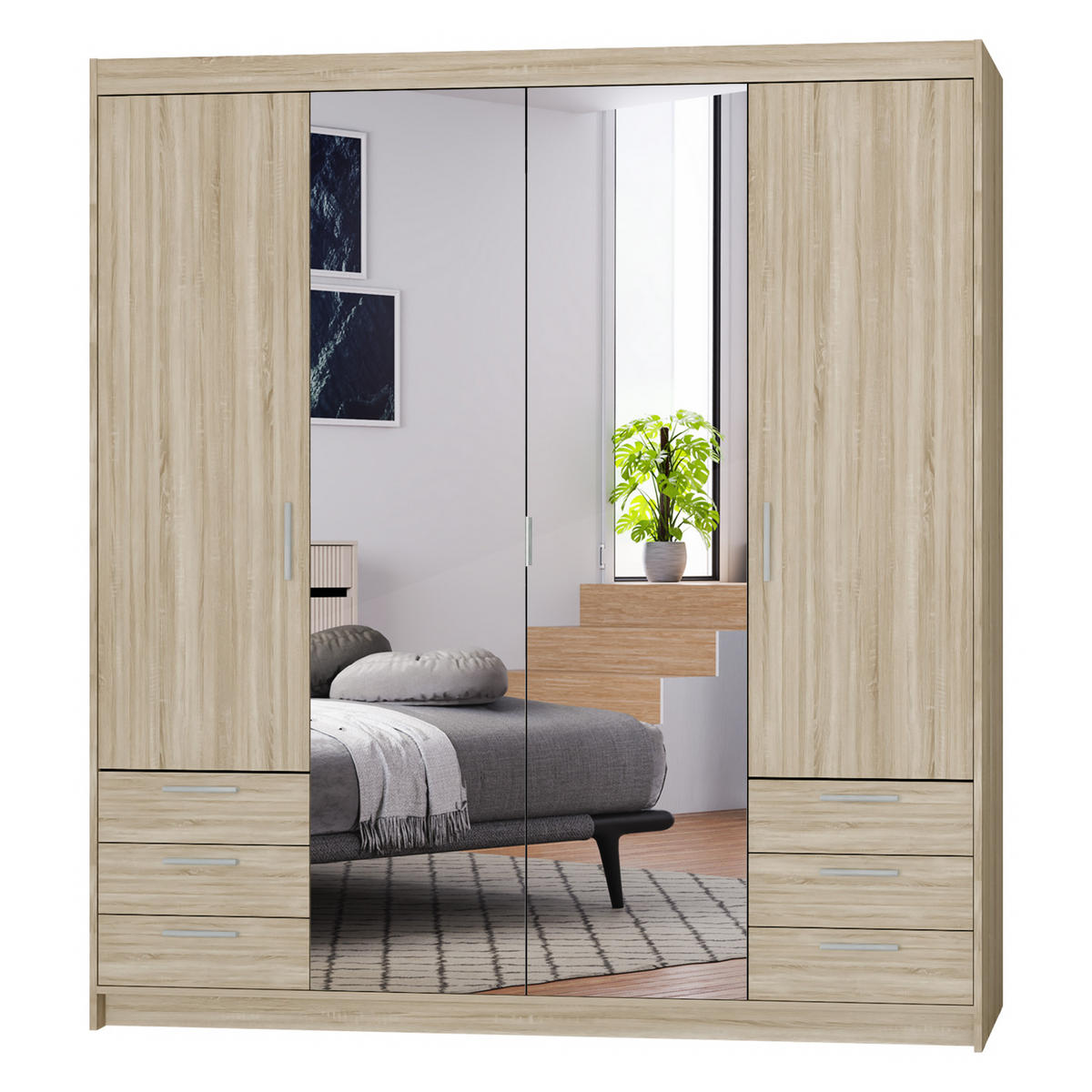 Der Kleiderschrank mit Spiegel Storicos vereint modernes Design mit Funktionalität. Ideal für große Schlafzimmer oder Garderoben, bietet er Eleganz und maximalen Stauraum.Der Schrank besteht aus laminierten Platten mit melaminbeschichteten Kanten, die ihn robust und kratzfest machen. Große Spiegel an den mittleren Türen vergrößern optisch den Raum und reflektieren Licht. Griffe aus Kunststoff und Metall runden das moderne Design ab. Dank der Rollenführungen mit 3/4-Auszug lassen sich die sechs geräumigen Schubladen leicht öffnen und schließen.Durchdachte Innenaufteilung: