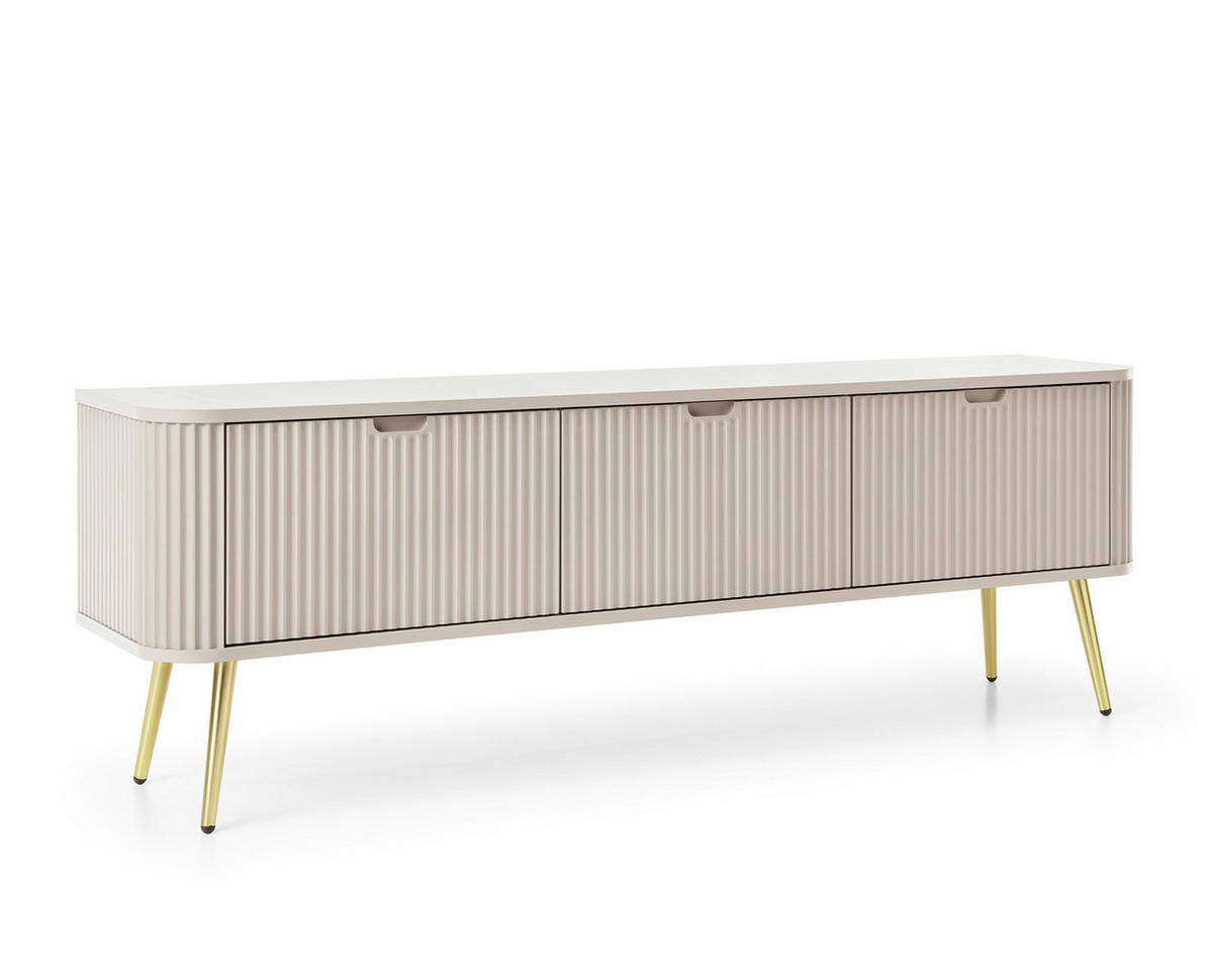 - Geriffelte Fronten, eingefräste Griffe, goldene hohe Füße.