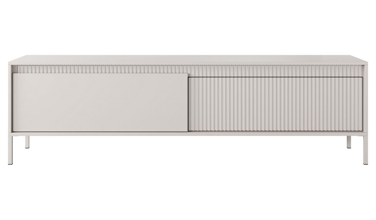 Der beige TV Bank Trentinis kombiniert modernes Design mit Funktionalität und istdie perfekte Wahl für stilvolle und gut organisierte Wohnräume. Mit einer Breite von187,1 cm bietet er ausreichend Platz für große Fernseher, Mediengeräte und Dekoration.Die geriffelten MDF-Fronten, kombiniert mit glatten Oberflächen, verleihen demMöbelstück Eleganz und Raffinesse. Die stabilen Metallfüße in Beige und das Push-to-Open-System sorgen für eine einfache Bedienung und unterstreichen dasminimalistische Design. Dieses Möbelstück eignet sich ideal als großer TV Schrank,der sich nahtlos in verschiedene Einrichtungsstile einfügt.Hinter den zwei Türen verbergen sich Fächer, die Platz für Kabel, DVDs oderSpielekonsolen bieten. Dank langlebiger laminierten Materialien und ABS-Kanten istder TV Tisch pflegeleicht und robust genug für den täglichen Gebrauch. Die Montageist unkompliziert und macht diesen TV Bank mit Türen zu einer praktischen undstilvollen Ergänzung in jedem Raum.Wichtigste Eigenschaften:• Geräumige Abmessungen: Breite: 187,1 cm, Höhe: 53,4 cm, Tiefe: 39,5 cm.• Push-to-Open-System für modernes, minimalistisches Design.• TV Bank mit zwei Türen und Fächern.• Hochwertige, pflegeleichte und stabile Materialien.• Einfache Montage: Lieferung in 1 Paket, inkl. Montagematerial & Anleitung.Der beige TV Bank Trentinis ist eine ideale Kombination aus Ästhetik und Funktionalität.