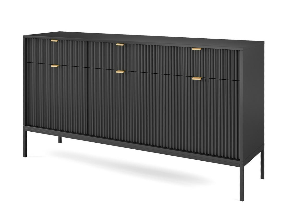 Das Sideboard mit Schubladen „Eternas KSZ154“ kombiniert auf 154 cm Breite modernes Design mit hervorragender Funktionalität. Mit seinen drei Schubladen und sechs geschlossenen Fächern ist es die perfekte Wahl für großzügige Wohnräume, die Eleganz und Ordnung erfordern. Diese Kommoden mit Schublade eignen sich ideal für Familien, Paare oder Einzelpersonen, die viel Stauraum in einem stilvollen Möbelstück suchen.Hauptmerkmale: