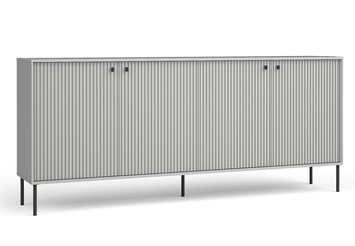 Die Kommode Modern Irelis in stilvollem Grau mit schwarzen Akzenten ist die perfekte Wahl für alle, die großzügigen Stauraum mit einem eleganten und zeitgemäßen Design verbinden möchten. Mit ihrer Breite von 207 cm wird diese große Kommode zum Blickfang in Schlafzimmer, Wohnbereich oder Flur und sorgt für ein harmonisches, aufgeräumtes Ambiente.Die Kommode ist modern mit vier Türen, hinter denen sich vier geräumige Ablagefächer befinden – ideal als Schrank Kommode oder Kommode für Kleider. Die feinen MDF-Riffelungen an den Fronten verleihen dem Möbelstück eine exklusive Note, während die schwarzen Metallbeine für Leichtigkeit und Stabilität sorgen. Die ovale Form der Griffe setzt dezente, elegante Akzente und unterstreicht den modernen Charakter des Möbels.Ob als Schlafzimmer Kommode, Sideboard 200 cm breit im Wohnzimmer oder funktionales Möbelstück im Homeoffice – diese Kommode modern fügt sich dank ihrer klaren Linien und des neutralen Farbschemas mühelos in verschiedene Einrichtungsstile ein. Die Tiefe von 40,5 cm macht sie zur idealen Lösung, als Schrank tief 40 cm für vielseitige Einsatzmöglichkeiten.Wichtige Merkmale: