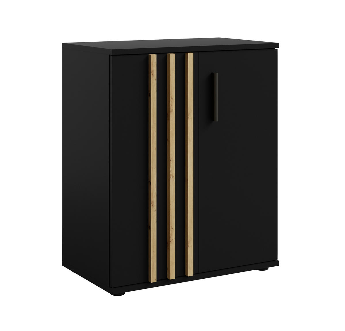 Der schwarze Korpus wird durch dekorative Lamellen im Farbton Artisan Eiche akzentuiert – ein modernes Design-Statement mit natürlichem Charakter. Hinter den beiden Türen verbergen sich zwei geschlossene Fächer, die für Ordnung sorgen und den Alltag erleichtern. Dank ihres kompakten Designs lässt sich die Kommode wunderbar mit anderen Möbelstücken kombinieren.