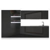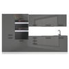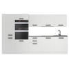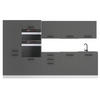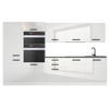 Farben: Fronten: Weiß Hochglanz*| Blenden: Weiß matt | Füße: Schwarz | Griffe: Dunkelschwarz | Arbeitsplatten: Silber-grau