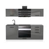 Farben: Fronten: Schwarz Hochglanz, Silber Hochglanz, Rot Hochglanz, Sonoma-Eiche, Wotan-Eiche, Glamour Wood, Königliches Ebenholz, Natürliche Kastanie, Weiß matt, Silber matt | Blenden: Weiß matt | Füße: Schwarz | Griffe: Dunkelschwarz | Arbeitsplatten: Silber-grau