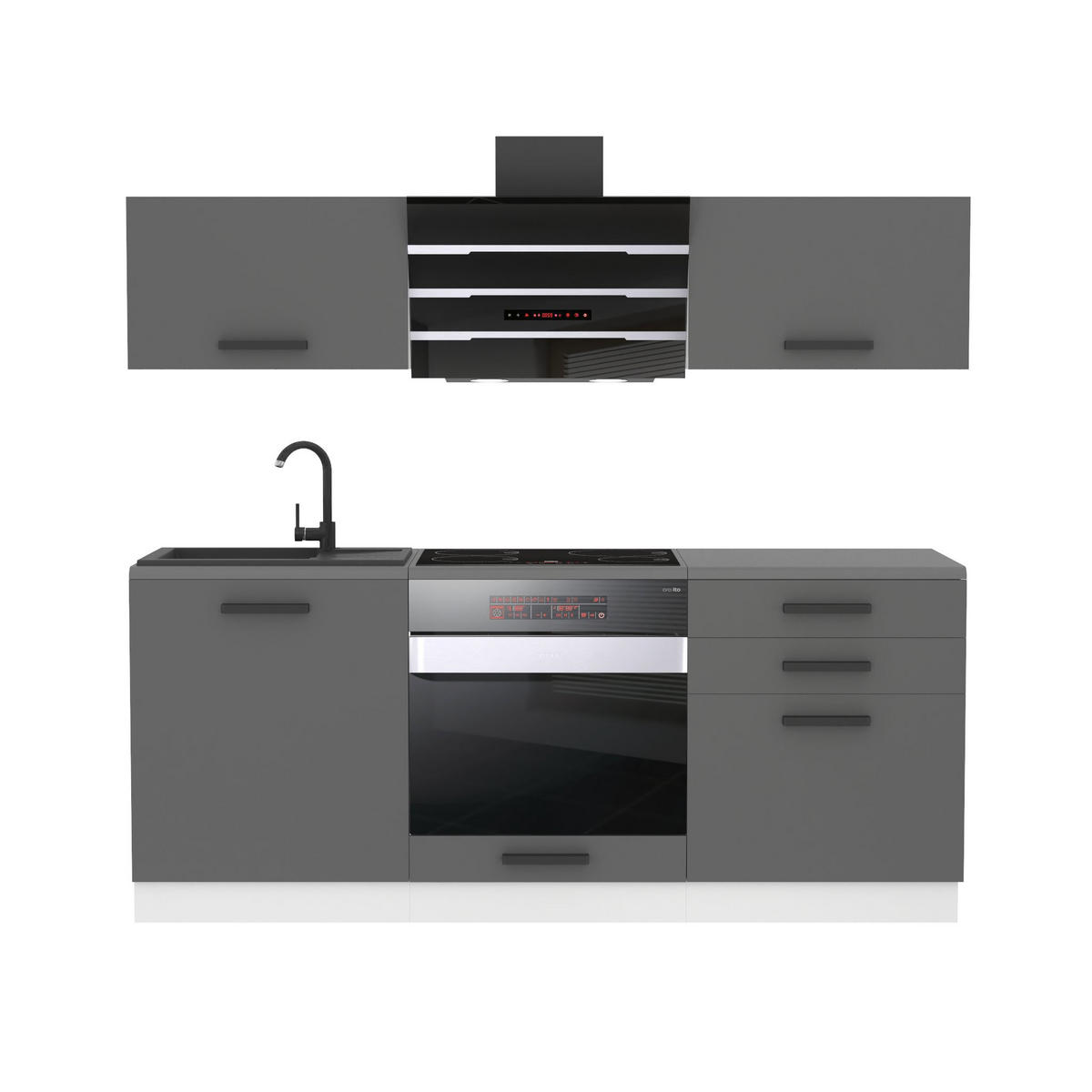 Farben: Fronten: Schwarz Hochglanz, Silber Hochglanz, Rot Hochglanz, Sonoma-Eiche, Wotan-Eiche, Glamour Wood, Königliches Ebenholz, Natürliche Kastanie, Weiß matt, Silber matt | Blenden: Weiß matt | Füße: Schwarz | Griffe: Dunkelschwarz | Arbeitsplatten: Silber-grau