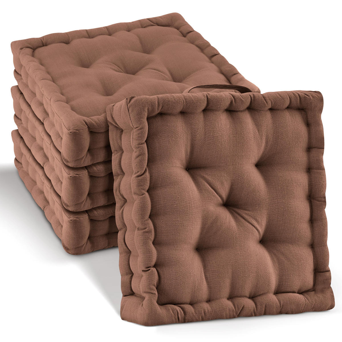 Beautissu Mila Stuhlkissen, 4er-Set (40 x 40 x 8 cm) in Braun. Bezug und Füllung aus 100% Polyester bieten eine bequeme, formstabile Sitzfläche mit 8 cm Polsterstärke. Die Kissen eignen sich als Stuhlkissen, Bodenkissen oder Rückenstütze und setzen zugleich ein dezentes Wohnakzent. Jeder Sitzpolster ist mit einem praktischen Tragegriff ausgestattet, sodass er sich leicht transportieren lässt – ideal für Wohnzimmer, Terrasse oder Outdoor-Einsätze. Gefärbter Polyesterbezug sorgt für gleichmäßige Farbe und robuste Oberfläche.