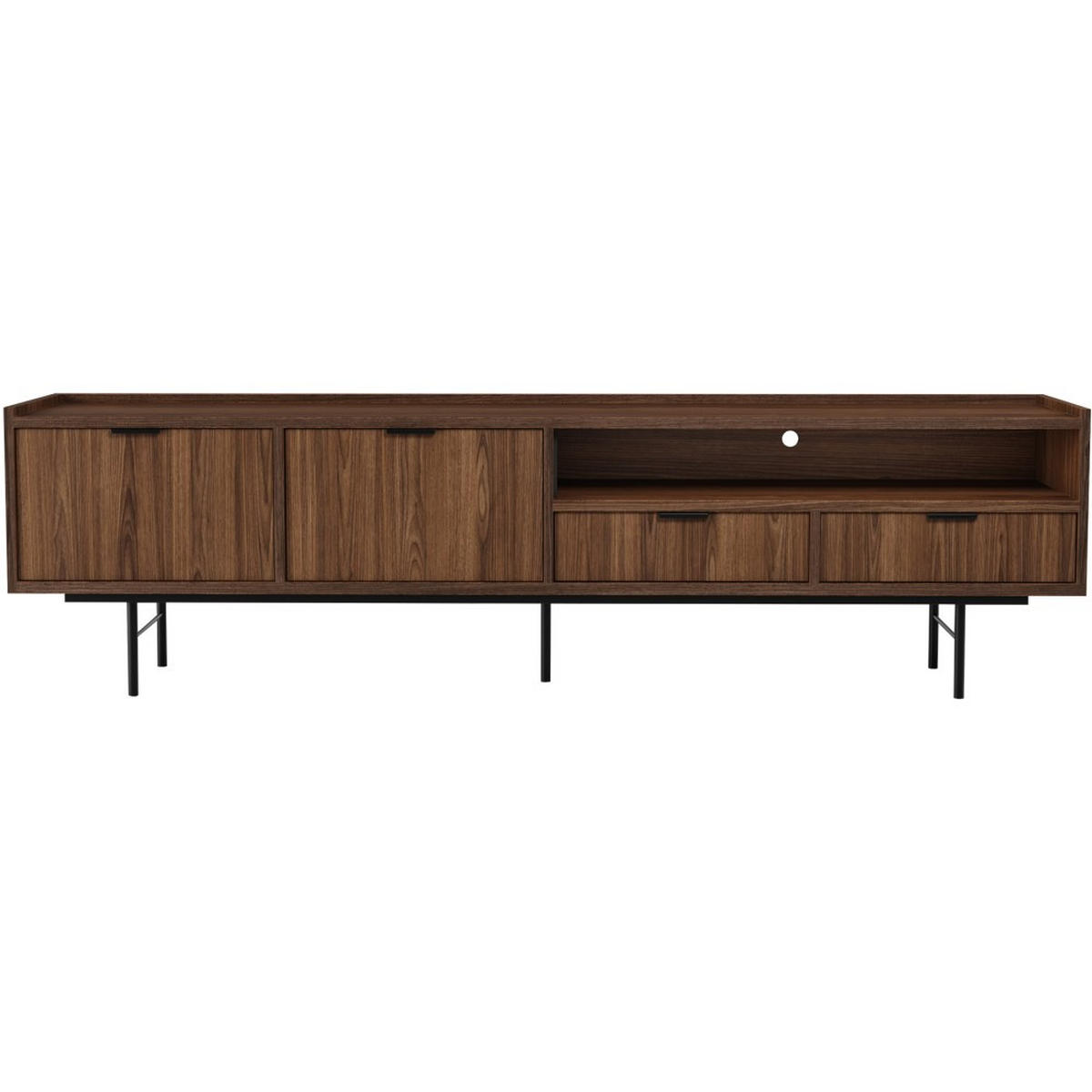 Der Schrank bietet durchdachten Stauraum: Zwei geschlossene Schränke mit Einlegeboden eignen sich ideal für Geräte, Kabel oder Zubehör. Zwei Schubladen mit kugelgelagerten Führungen lassen sich leise und leichtgängig öffnen und bieten Platz für Fernbedienungen, Spiele oder Kleinteile. Die lange offene Ablage über den Schubladen ermöglicht schnellen Zugriff auf Receiver, Konsole oder Dekoration und rundet das durchdachte Stauraumkonzept ab.