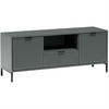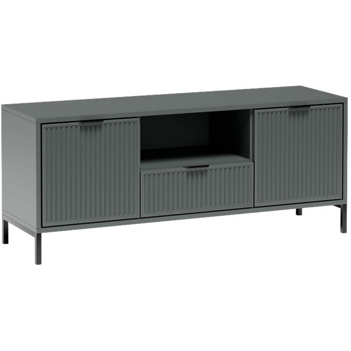 Die moderne TV-Kommode LINNA überzeugt durch ihr minimalistisches Design, klare Linien und durchdachte Funktionalität. Das markante Merkmal dieses Modells sind die stilvoll gefrästen Fronten, die der Kommode einen unverwechselbaren Charakter verleihen. Mit zwei Türen und zwei offenen Fächern bietet sie ausreichend Platz für Elektronikgeräte, Medienzubehör und Dekoration – ideal für das Wohnzimmer oder den Medienbereich.