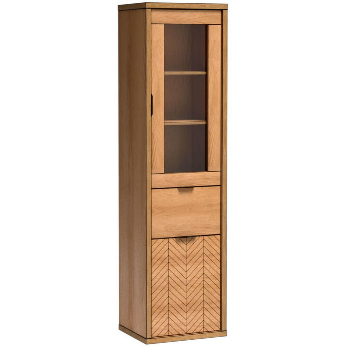 Die Vitrine mit 1 Schublade und 2 Türen aus der FUN-Serie vereint modernes Design mit durchdachter Funktionalität. Die Kombination aus einer Glastür und einer Tür mit angesagter Fischgrät-Optik sorgt für einen spannenden Materialmix und verleiht dem Möbelstück einen eleganten, urbanen Look.