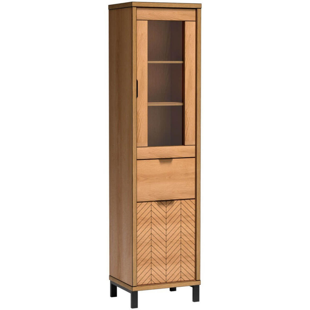 Die Vitrine mit 1 Schublade und 2 Türen aus der FUN-Serie vereint modernes Design mit durchdachter Funktionalität. Die Kombination aus einer Glastür und einer Tür mit angesagter Fischgrät-Optik sorgt für einen spannenden Materialmix und verleiht dem Möbelstück einen eleganten, urbanen Look.