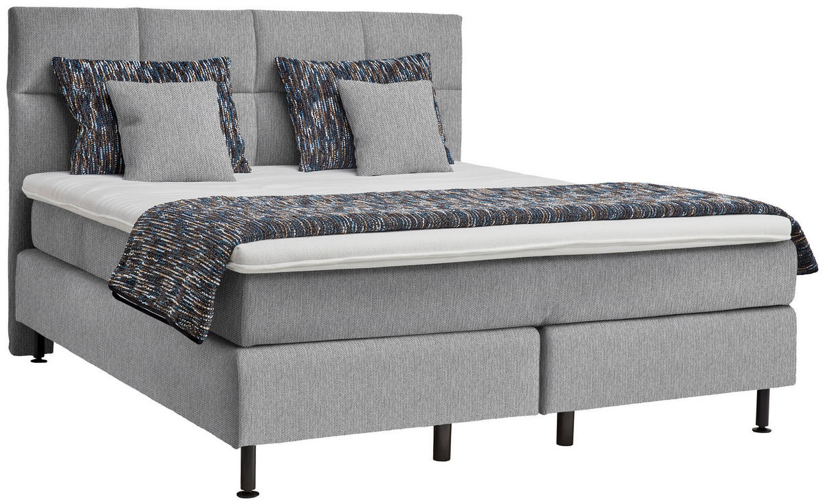 Schwarz, die zudem das Design stylish aufwerten. Rein in die Komfortzone: Dieses Boxspringbett (ca. 160 x 200 cm) in Hellgrau mit Matratze, Topper und gepolstertem Kopfteil entführt Sie auf ein traumhaftes Terrain zum geruhsamen Durchatmen!