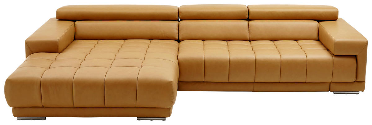 Ab auf Ihr currygelbes Ecksofa mit Leder-Bezug und die ersehnte Me-Time genießen!