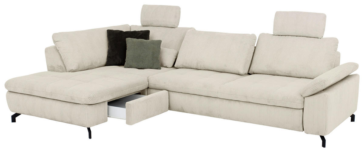Können Sie sich etwas Besseres vorstellen als auf diesem creme- und naturfarbenen Ecksofa mit Cord-Velours-Bezug alles um sich herum zu vergessen?
