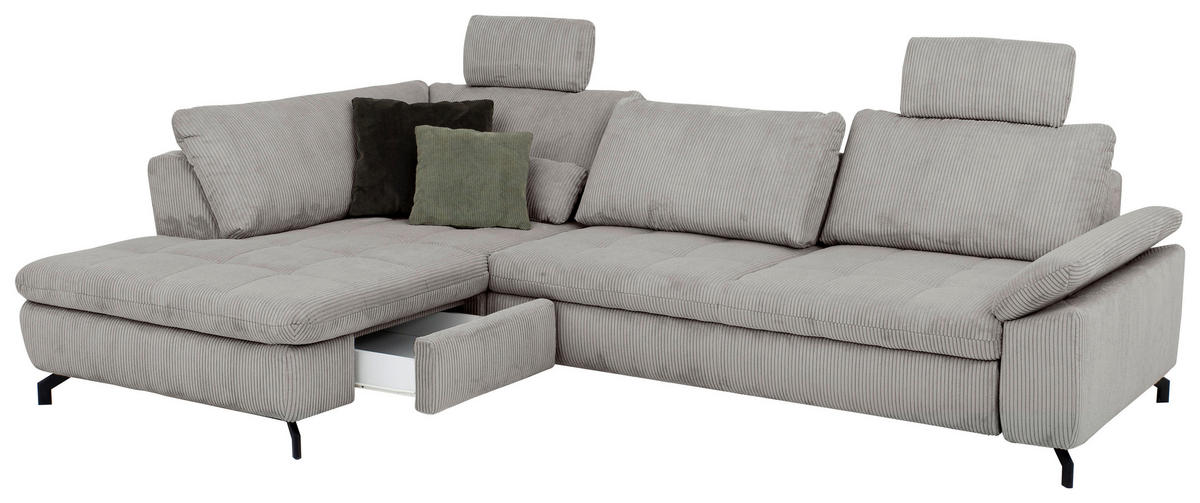 Gönnen Sie sich mit diesem grauen Ecksofa mit Cord-Velours-Bezug ein famoses Upgrade für Ihr geliebtes Heim!