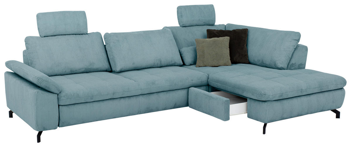 Sichern Sie sich mit diesem hellblauen Ecksofa mit Cord-Velours-Bezug das, was Ihnen am meisten bedeutet, wenn sich alles um das Thema Heimeligkeit dreht!