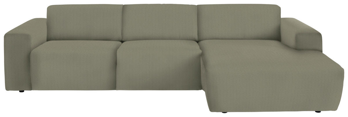 Im Lieferumfang enthalten: Rein in die Komfortzone: Dieses olivgrüne Ecksofa mit Feincord-Bezug entführt Sie auf ein traumhaftes Terrain zum geruhsamen Durchatmen!