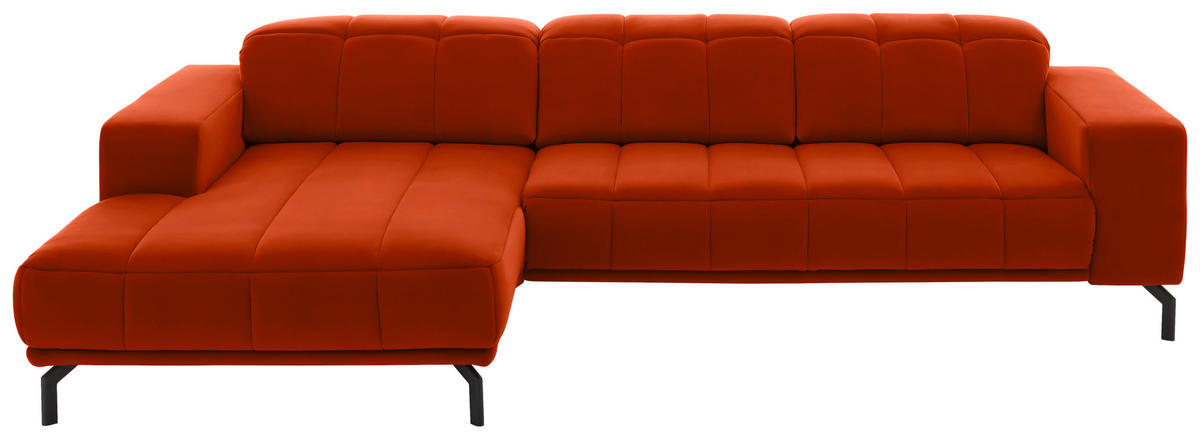 Gönnen Sie sich mit diesem orangen Ecksofa mit Velours-Bezug ein famoses Upgrade für Ihr geliebtes Heim!