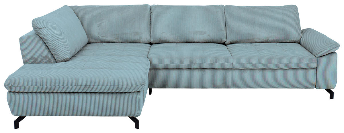 Im Lieferumfang enthalten: Wenn dieses hellblaue Ecksofa mit Cord-Velours-Bezug bei Ihnen einzieht, übernimmt Behaglichkeit das Kommando!