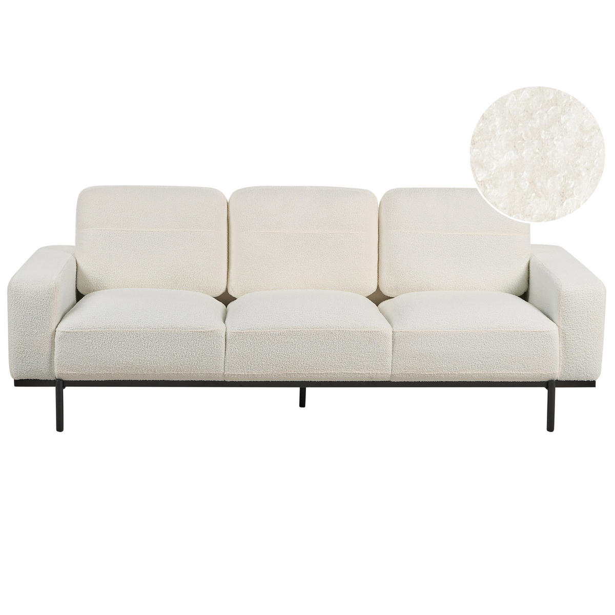Modernes 3-Sitzer Sofa aus edlem Bouclé-Stoff mit dicken Sitzkissen und breiten Armlehnen. Diese robuste Couch begeistert sowohl mit ihrem modernen Look als auch mit ihrer Gemütlichkeit und robusten Holz-Konstruktion. Der Dreisitzer verfügt über dick gepolsterte Rücken- und Sitzkissen, in denen Sie regelrecht versinken können. Die breiten Armlehnen unterstreichen nicht nur den Look des Sofas, sie steigern auch den Sitzkomfort. Der Bouclébezug verspricht sowohl einen luxuriösen Look als auch eine angenehme Haptik und wertet dabei jeden Raum mühelos auf. Seine ansprechende Ausstrahlung erstreckt sich auch auf die robusten Metallbeine, die einen urbanen Akzent setzen, der das Auge fesselt.