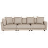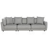 Hellgraues 3-Sitzer Polstersofa mit mehreren Dekokissen. Dieses große Stoffsofa strahlt pure Gemütlichkeit aus und eignet sich perfekt für jede Wohnzimmerecke. Die 3-Sitzer Couch besitzt einen hochwertigen Stoffbezug aus strapazierfähigen Fasern, die sich sowohl angenehm anfühlen, als auch pflegeleicht sind. Sie können das Polstersofa frei im Raum platzieren, da jede seiner Seiten vollständig bezogen ist. Bei dem Modell werden dicke Sitz- und Rückenkissen mit zusätzlichen Dekokissen kombiniert, so können Sie jederzeit mit einem fabelhaften Sitz- und Liegekomfort rechnen. Zudem sind die Polster mit praktischen Klettverschlüssen versehen, die sie bei jedem Fernsehabend an Ort und Stelle halten.