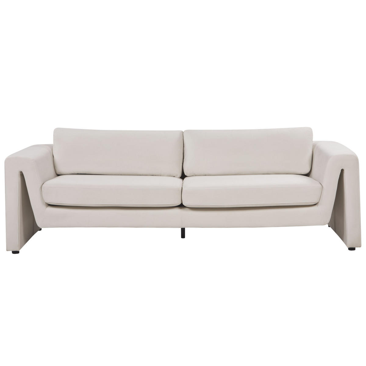Modernes, formschönes 3-Sitzer Polstersofa mit dicken Sitzkissen und breiten Armlehnen. Lassen Sie sich von der vollendeten Formschönheit, dem geschmeidigen Samtbezug und himmlischen Komfort dieses Sofas verzaubern. Das Untergestell der Sitzfläche, die Krabbenbeine und breiten Armlehnen verschmelzen niveauvoll miteinander und lassen Sie regelrecht beim Sitzen, wie auf einer Wolke schweben. Die dicken Sitz- und Rückenkissen unterstützen dieses wohlige Sitzgefühl. Dabei sind die Rückenkissen auf der Lehne so platziert, dass sie sanft nach hinten geneigt sind, damit Sie sich bei jedem Fernsehabend perfekt zurücklehnen können. Dank der zusätzlichen Klettverschlüsse bleiben die Kissen stets an Ort und Stelle. Der helle Farbton und das unwiderstehliche Design des Samtsofas finden sich sicherlich nicht nur in jedem modernen Loft-Stil zurecht.