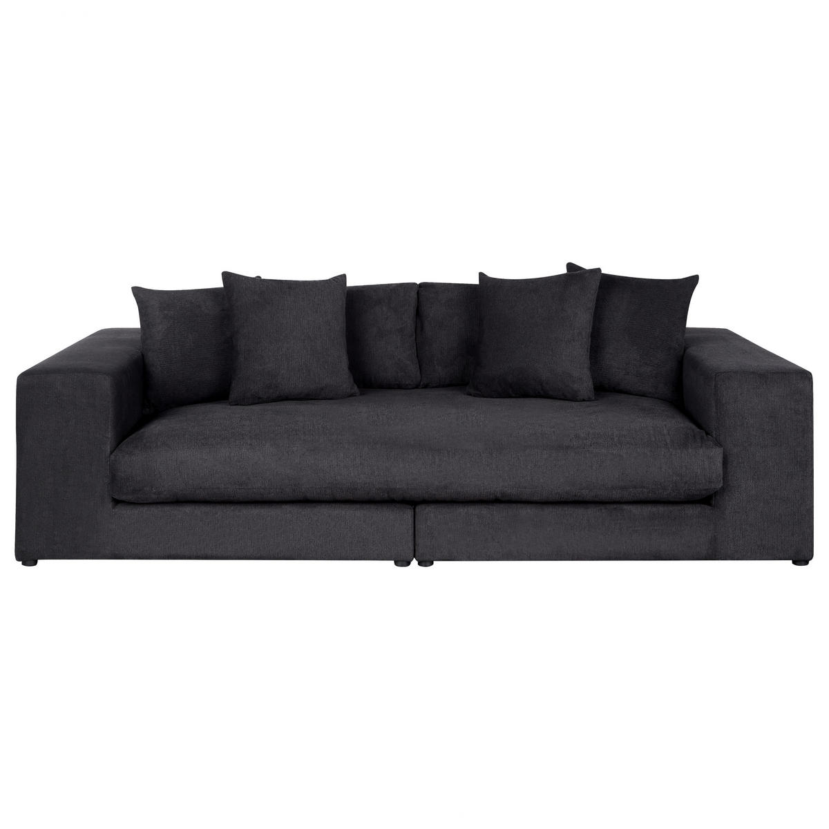 Gemütliches, schwarzes Sofa für bis zu 3 Personen mit passenden Dekokissen. Auf diesem gemütlichen Stoffsofa ist jeder Augenblick ein Genuss. In einem universellen Farbton gefertigt, ergänzt es mühelos jede Einrichtung. Seine dicken Sitz- und Rückenkissen sowie die angenehme, strukturierte Stoffpolsterung sorgen für einen fabelhaften Komfort und verschaffen Ihnen einen gemütlichen Ort, an dem Sie entspannen können. Das Wohnzimmersofa bezaubert auch mit seinen dicken Armlehnen, seiner robusten Konstruktion und seinen dicken, niedrigen Kunststoffbeinen. Dank der integrierten Reißverschlüsse an den Dekokissenbezügen ist die Pflege und Reinigung des Modells regelrecht ein Kinderspiel.
