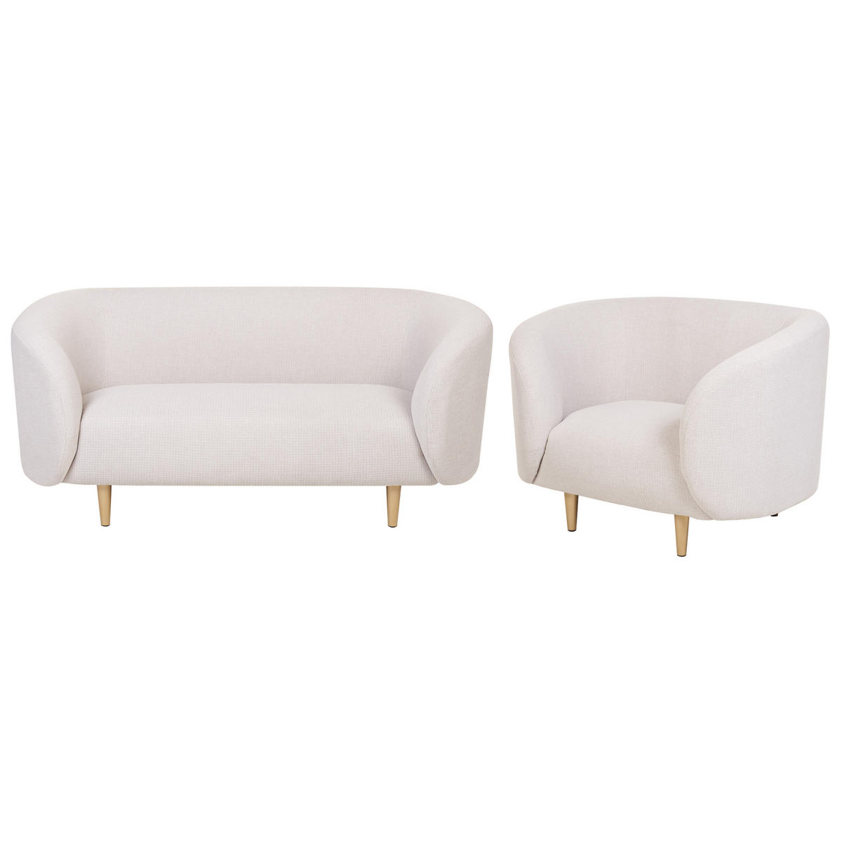 Gemütliche Sitzgruppe im Art-Déco-Stil. Dieses schöne Sofa-Set strahlt Luxus aus, von den goldenen Beinen bis zu den sanften Linien des gepolsterten Designs. Mit einem strapazierfähigen Stoff überzogen, ist es angenehm weich und bequem und verleiht dem Raum ein gemütliches Ambiente. Die Polsterung der Sitze bietet einen hohen Sitzkomfort und macht das Set zum idealen Platz, um bis spät in die Nacht zu lesen oder fernzusehen. Das elegante Design der Sofas und Sessel ist die perfekte Ergänzung zu eklektischen, traditionellen oder Mid-Century-Einrichtungen.