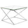 Moderner Beistelltisch mit Glasplatte und Metallbeinen in Silber. Dieser schöne Tisch mit seinem schlichten, eleganten Design kann als Beistelltisch in Ihrem Wohnraum oder als dekorative Bereicherung der Einrichtung eingesetzt werden. Er besteht aus einer hochwertigen Glasplatte, durch welche die silberne Metallstruktur hindurch scheint und mit ihrem wundervollen Design das Auge besticht. Schaffen Sie sich einen besonderen Platz für Ihr Weinglas, dass Sie so während eines gemütlichen Leseabends immer in Reichweite haben können.
