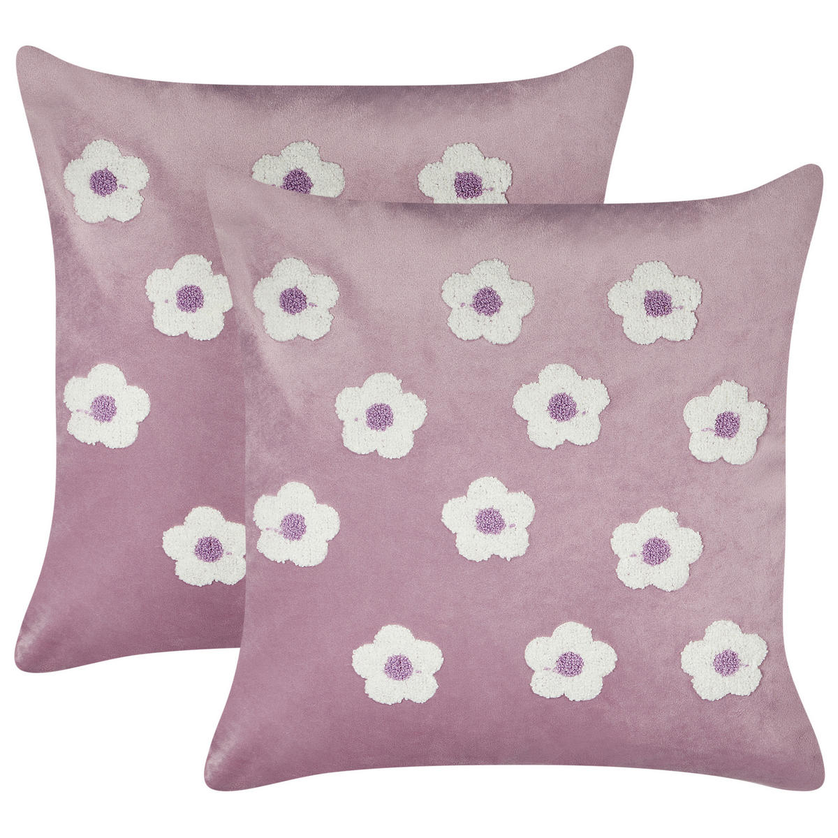 Zwei Sofakissen mit Blumen-Stickereien. Dieses dekorative Kissenset ist ein echter Hingucker für Ihr Zuhause. Die Kissen aus strapazierfähigem Polyesterstoff in Violett sind die perfekte Ergänzung für Ihr Schlaf- oder Kinderzimmer, da sie auf der Vorderseite mit einem trendigen Blumenmotiv bestickt sind. Durch die schicke Farbe und das trendige Muster passen sie zu vielen Einrichtungsstilen, von Boho bis modern. Beide Kissen sind mit abnehmbaren Bezügen ausgestattet, die eine einfache Reinigung ermöglichen.