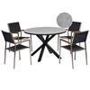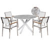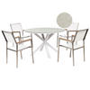 Runder Gartentisch aus Aluminium mit 4 bespannten Edelstahlstühlen. Dieses stilvolle Gartenset, bestehend aus einem geräumigen runden Tisch und vier Stühlen, ist ideal für alle, die gerne Gäste empfangen. Der leichte, aber robuste Aluminiumtisch mit einer Tischplatte aus Keramikglas in Marmoroptik bietet ausreichend Platz für alles, was man zum Essen braucht, und die stabilen Edelstahlstühle mit Stoffbespannung sorgen für Komfort. Die neutrale Farbpalette bietet vielseitige Gestaltungsmöglichkeiten und die UV-, licht-, wasser-, flecken- und rostbeständigen Materialien sorgen für eine lange Haltbarkeit.