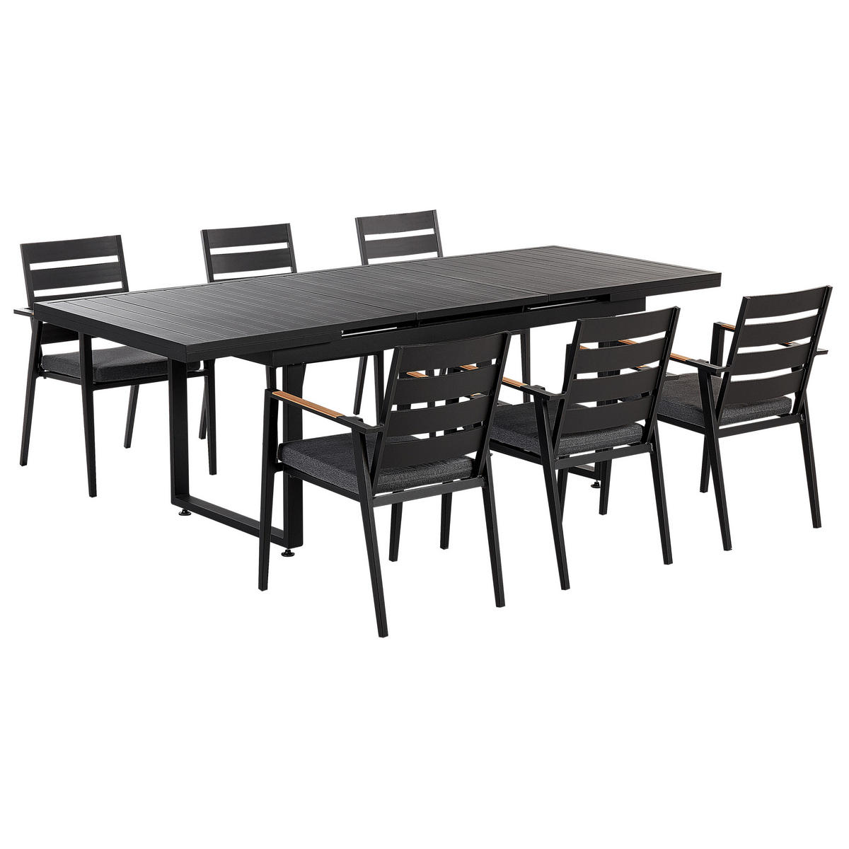 Ausziehbarer Esstisch für den Außenbereich mit 6 schwarzen Stühlen und passenden grauen Sitzkissen. Mit diesem stilvollen Ausziehtisch und den 6 bequemen Gartenstühlen sind Sie immer für jeden kleineren als auch größeren Besuch gerüstet. Der Outdoor-Tisch verfügt über einen versteckten Tischplattenteil, die under der Tischplatte befestigt ist und sich beim Ausziehen des Tisches automatisch aufrichtet. Die stabilen Metallgestelle sind extrem langlebig, strapazierfähig und wurden zusätzlich pulverbeschichtet, um die Korrosions- und Witterungsbeständigkeit des Sets zu erhöhen. Die Bezüge der weich gepolsterten Sitzkissen sind bequem und einfach abnehmbar, so dass selbst die Reinigung der Gartenmöbel zu einem Vergnügen wird. Dabei sind die Alu-Stühle platzsparend verstaubar und wegen ihres leichten Gewichts auch einfach transportierbar.