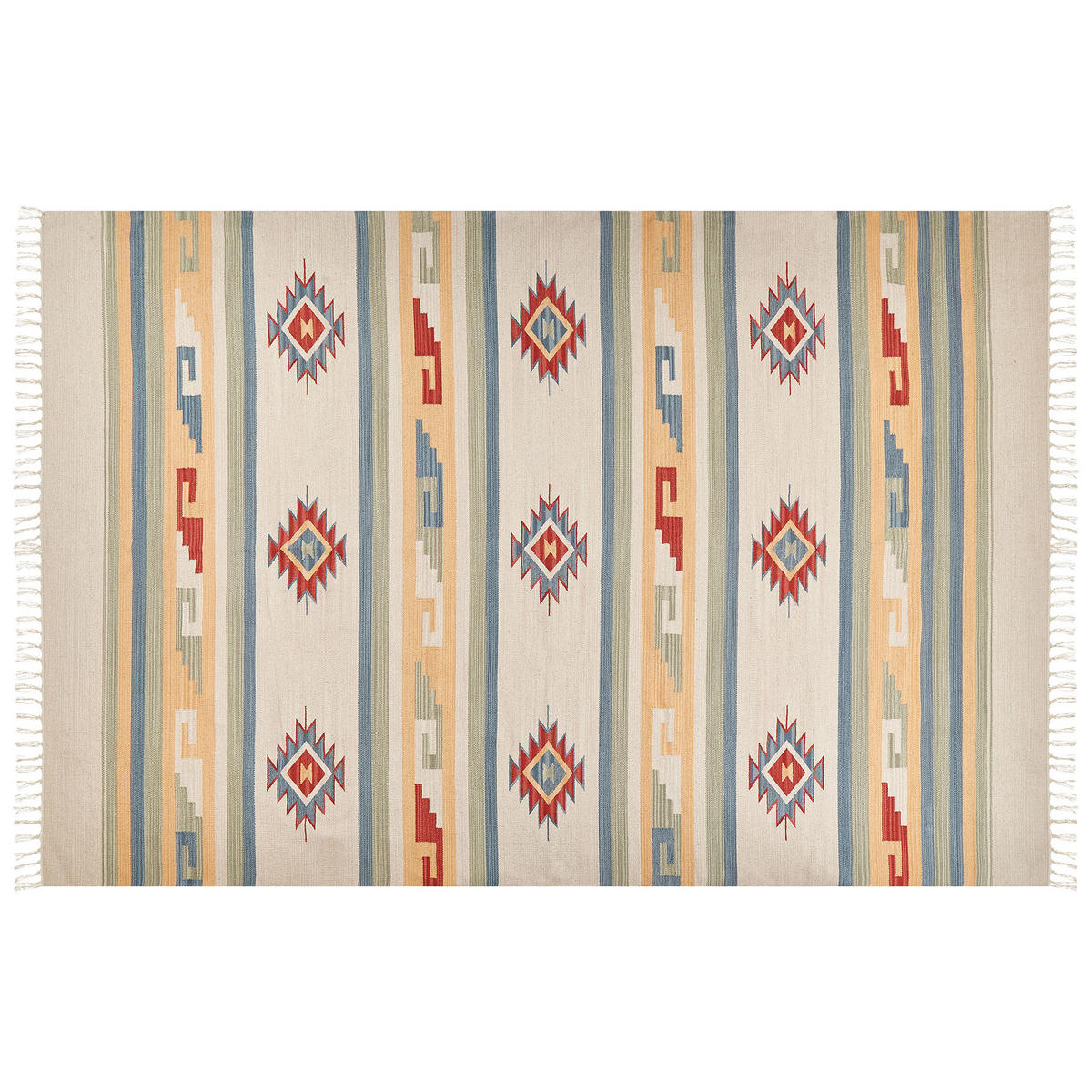 Handgewebter, rechteckiger Baumwollteppich mit stilvollem Muster und hellen Fransen. Dieser flach gewebter Teppich besteht aus hochqualitativen Baumwollfasern und bezaubert mit seiner Einzigartigkeit. Er ist mithilfe einer traditionellen Handwebtechnik gefertigt worden und erhält dadurch einen originellen Look. Während dieses Prozesses wird sein farbenprächtiges Motiv auf beide Seiten des Kelims aufgetragen, so können Sie ihn auf jeder dieser Seiten nutzen. Die zusätzlichen Fransen an den Teppichseiten verleihen ihm einen gemütlichen Touch und passen perfekt zu dem farbenfrohen Muster. Die natürlichen Materialien machen das Modell sehr ausdauerfähig und langlebig, sodass man den Kurzhaar-Teppich sowohl in leicht als auch in stark frequentierten Bereichen platzieren kann.