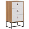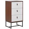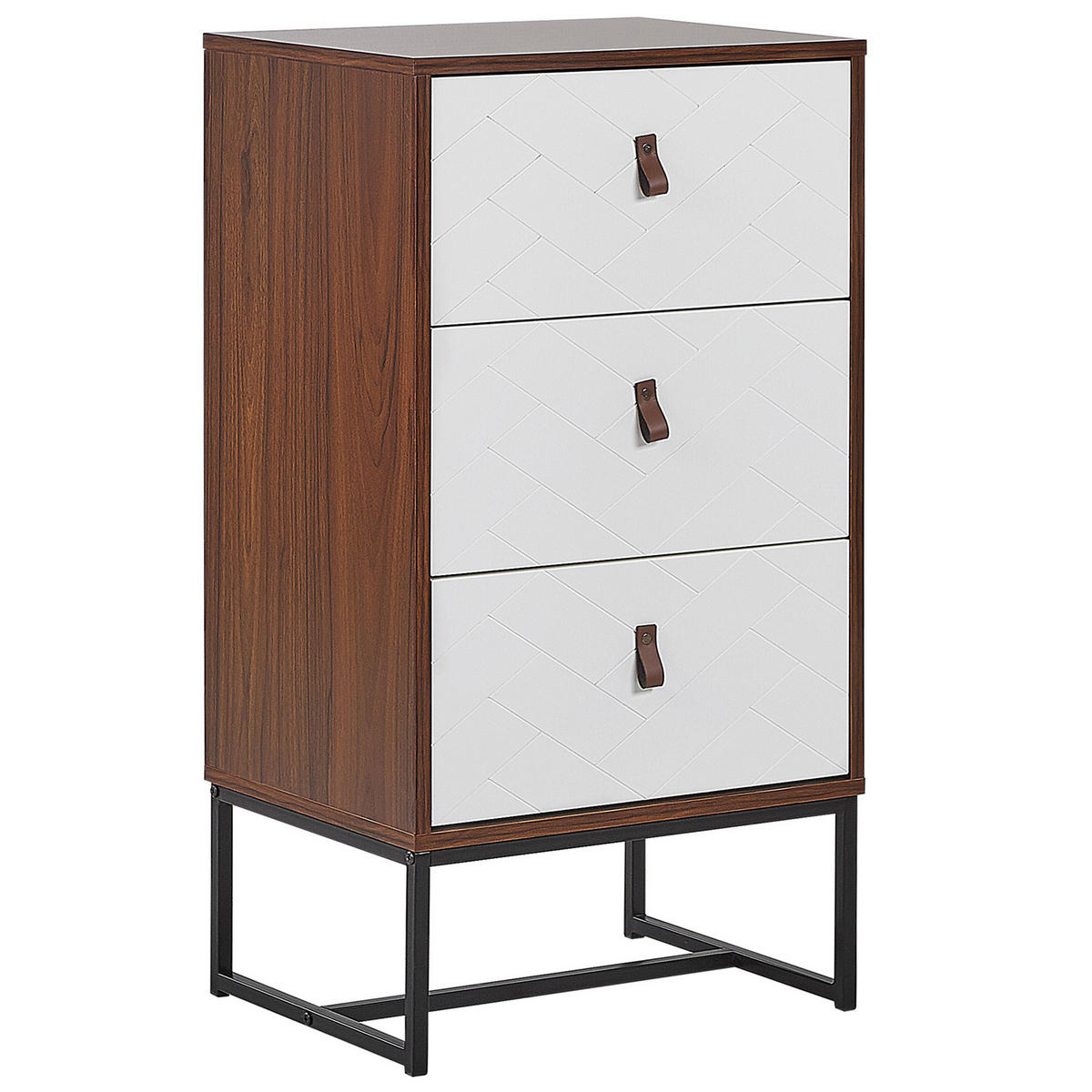 Moderne Kommode mit 3 Schubladen mit Fischgrätenmuster. Diese elegante und kompakte Kommode garantiert Ihnen viel Stauraum und nimmt gleichzeitig wenig Platz ein! Auf der oberen Ablagefläche im dunklen Holzfarbton können Vasen oder Bilderrahmen dekorativ platziert werden. Die drei geräumigen Schubladen sind mit einem trendigen Fischgrätenmuster bestückt und ermöglichen Ihnen alle Kleinigkeiten, Unterlagen und Accessoires an einer Stelle unterzubringen. Die pulverbeschichteten Metallbeine sind äusserst standfest und verleihen dem Möbelstück einen industriellen und innovativen Look.