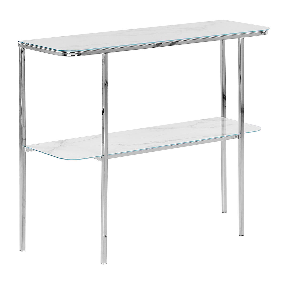 Glamouröser Schminktisch mit Marmor-Effekt und zusätzlicher Ablage. Bringen Sie mit diesem glamourösen Konsolentisch Eleganz und Funktionalität in Ihren Wohnraum. Die zwei Glasablagen in Marmor-Optik werden Ihr Wohnzimmer, Ihren Flur oder Ihr Schlafzimmer bereichern. Das Möbelstück bietet auch genügend Platz, um dekorative Vasen auszustellen oder die Dinge zu organisieren, die Sie griffbereit haben möchten. Die stabilen, silbernen Metallbeine mit glänzendem Finish ergänzen das elegante Gesamtbild des Möbelstücks.