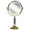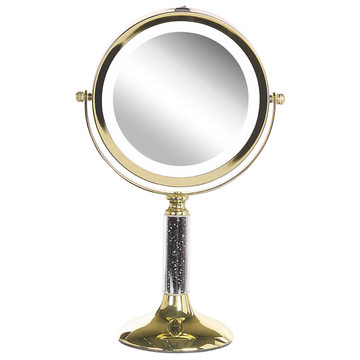 Klassischer Tischspiegel mit Vergrößerung. Werten Sie Ihr Badezimmer oder Ihren Schminktisch mit diesem praktischen Schminkspiegel auf. Sein modernes Design macht ihn zu einer hervorragenden Ergänzung für jeden Raum. Der robuste Eisenrahmen ist mit einer glänzenden Oberfläche versehen, die den verzierten Sockel wunderschön zur Geltung bringt und für ein elegantes Design sorgt. Dank des Drehmechanismus können Sie leicht zwischen der normalen und der fünffachen Vergrößerungsseite wechseln. Zudem bietet die eingebaute LED-Beleuchtung zusätzlichen Komfort.