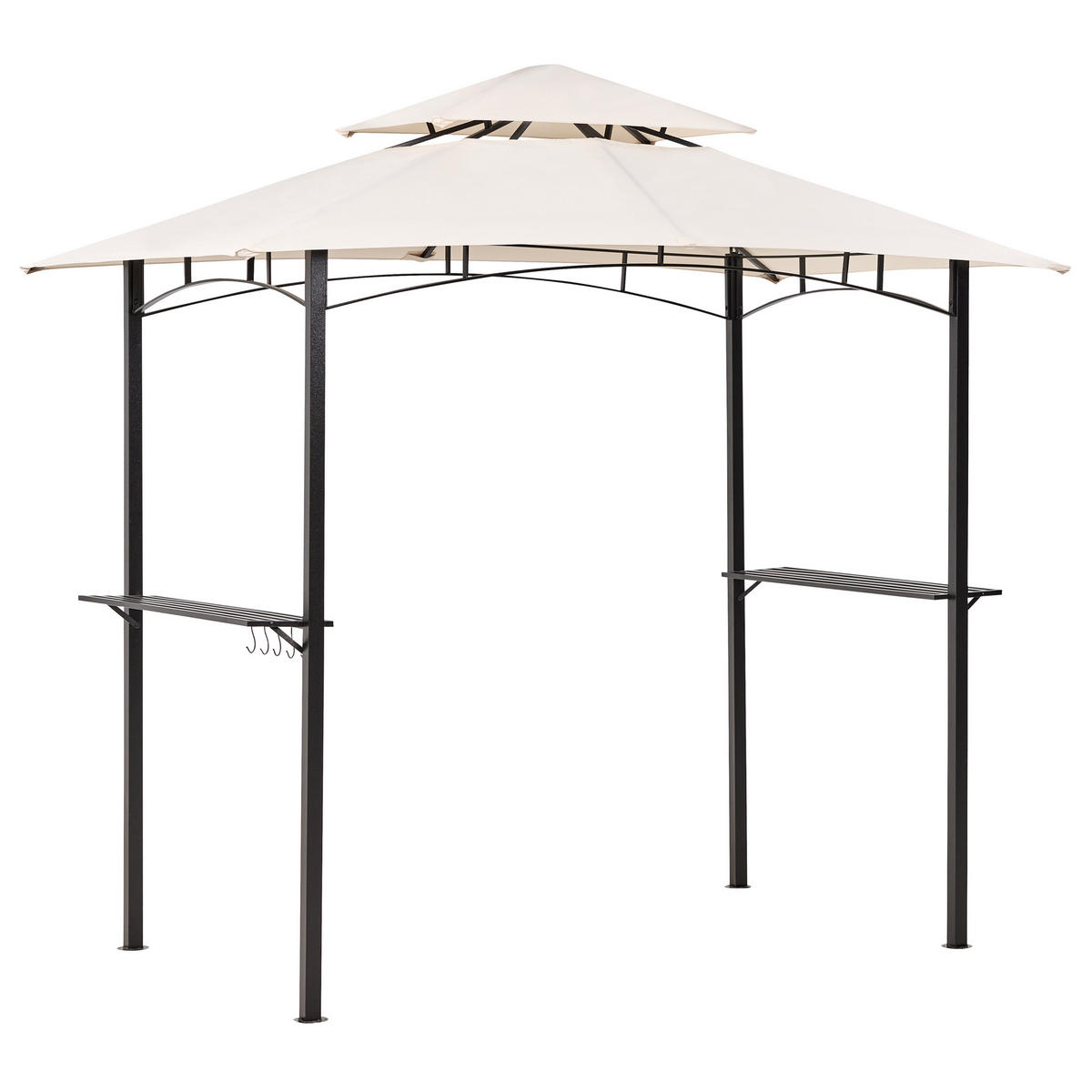 Moderner Gartenpavillon mit Regalanlagen. Richten Sie Ihren Garten mit diesem Gartenpavillon für die Grillsaison und warme Sommerabende mit Freunden und Familie ein. Er bietet ausreichend Platz für ein kleines Ess- oder Loungeset. Er ist aus langlebigem, pulverbeschichtetem Stahl gefertigt, der für eine stabile Struktur sorgt. Das Vordach ist aus einem Material gefertigt, das perfekt vor UV-Strahlen schützt, und verfügt über eine Öffnung im Dach, die eine durchgehende Belüftung gewährleistet. Darüber hinaus verfügt der Pavillon über Metallregale und Haken, die zur Aufbewahrung von Utensilien oder zur Aufstellung von Blumentöpfen verwendet werden können und ihn so noch stilvoller machen.