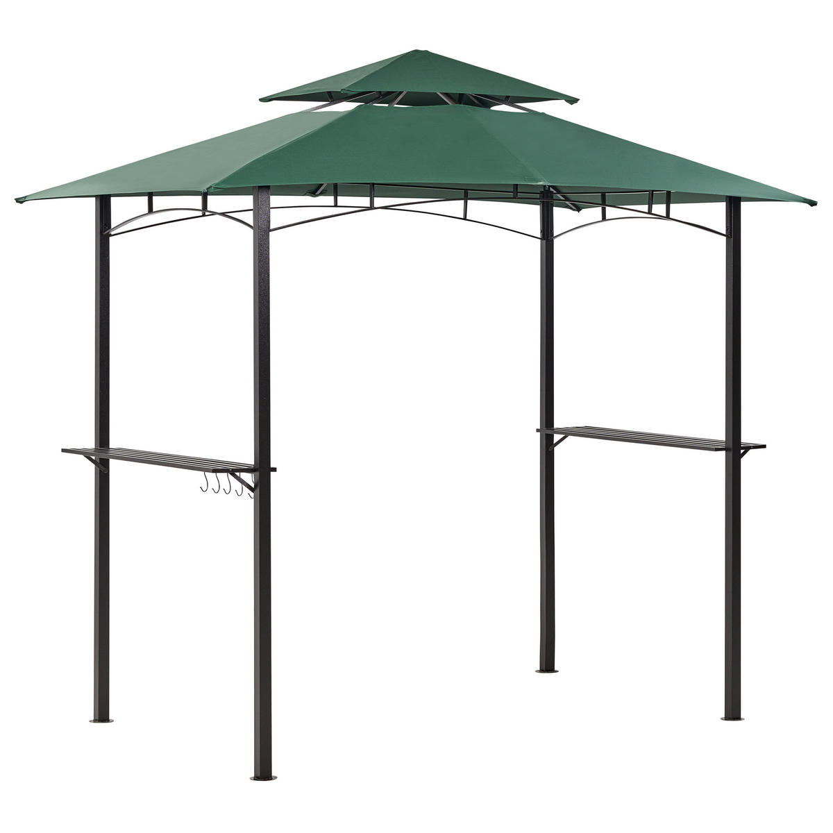 Moderner Gartenpavillon mit Regalanlagen. Richten Sie Ihren Garten mit diesem Gartenpavillon für die Grillsaison und warme Sommerabende mit Freunden und Familie ein. Er bietet ausreichend Platz für ein kleines Ess- oder Loungeset. Er ist aus langlebigem, pulverbeschichtetem Stahl gefertigt, der für eine stabile Struktur sorgt. Das Vordach ist aus einem Material gefertigt, das perfekt vor UV-Strahlen schützt, und verfügt über eine Öffnung im Dach, die eine durchgehende Belüftung gewährleistet. Darüber hinaus verfügt der Pavillon über Metallregale und Haken, die zur Aufbewahrung von Utensilien oder zur Aufstellung von Blumentöpfen verwendet werden können und ihn so noch stilvoller machen.