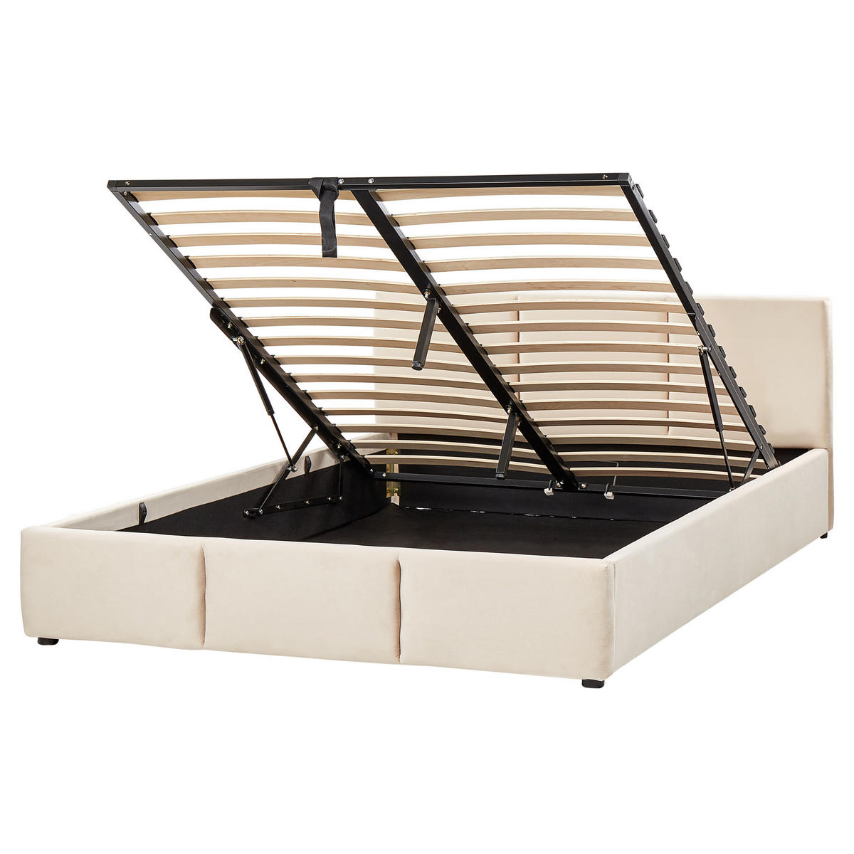 Modernes, hellbeiges Doppelbett mit hohem Kopfteil und hochklappbarem Lattenrost. Möchten Sie sowohl Stauraum als auch mehr Platz für andere Möbel in Ihrem Schlafzimmer haben? Dieses Stauraumwunder wird Ihnen noch viel mehr bieten. Sein hohes Kopfteil überlässt Ihnen einen komfortablen Platz zum Anlehnen und Sitzen, während der integrierte Lattenrost für optimalen Liegekomfort sorgt. Zudem ist der hochklappbare Federholzlattenrost mit einer praktischen Gasdruckfeder und einem Band ausgestattet, die Ihnen den Zugang auf den Stauraum freigeben und Ihren Alltag wesentlich erleichtern. Dank des Unterkastens verstecken Sie nicht nur Ihre Bettwäsche, Sie nutzen dabei auch die Unterseite des Modells voll aus. Der geschmeidige Samtbezug und die passenden Steppungen am Kopf- und Fußteil versprechen Eleganz, die sich schon von Weitem sehen lässt.