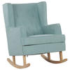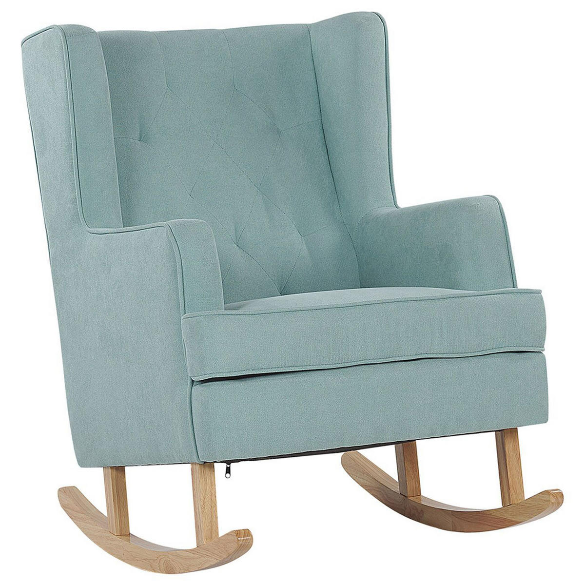 Großer, gemütlicher Schaukelstuhl in Mintgrün mit versteppter Rückenlehne. Ein klassischer Schaukelsessel der einen ultimativen Sitzkomfort bietet! Der Stuhl ist mit strapazierfähigem, angenehmen Stoff in einem edlen Mintgrünenton gepolstert und basiert auf massiven Gummibaumholzkufen, die ihn sanft hin- und herschaukeln lassen. So erhalten Sie einen perfekten Ort zum Entspannen beim Fernsehen oder Lesen eines Buches. Die rautenförmigen Nähte auf dem weichem Polsterbezug veredeln seine Ausstrahlung und versprühen ein zartes Retro Flair im Raum.