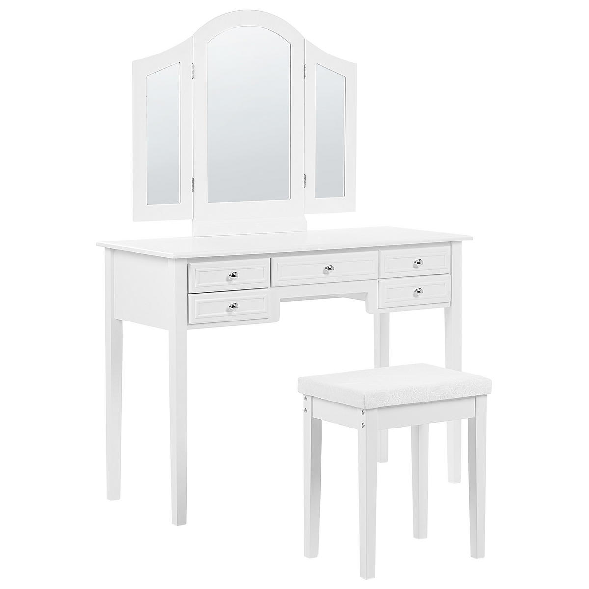 Eleganter und minimalistischer Frisiertisch in Weiß. Machen Sie Ihre morgendlichen Routinen zu einem wahren Vergnügen und organisieren Sie Ihre Kosmetika in einem eleganten Schminktisch. Das Möbelstück ist mit einem zweitürigen Spiegel ausgestattet, der es Ihnen ermöglicht, sich aus allen Blickwinkeln zu betrachten. Fünf schöne Schubladen mit dekorativen Elementen bieten reichlich Platz für all Ihre wichtigen Produkte und Kleinigkeiten. Ein stilvoller Hocker mit einem floral gemusterten Stoff macht das Schminken unter diesen Bedingungen besonders komfortabel.
