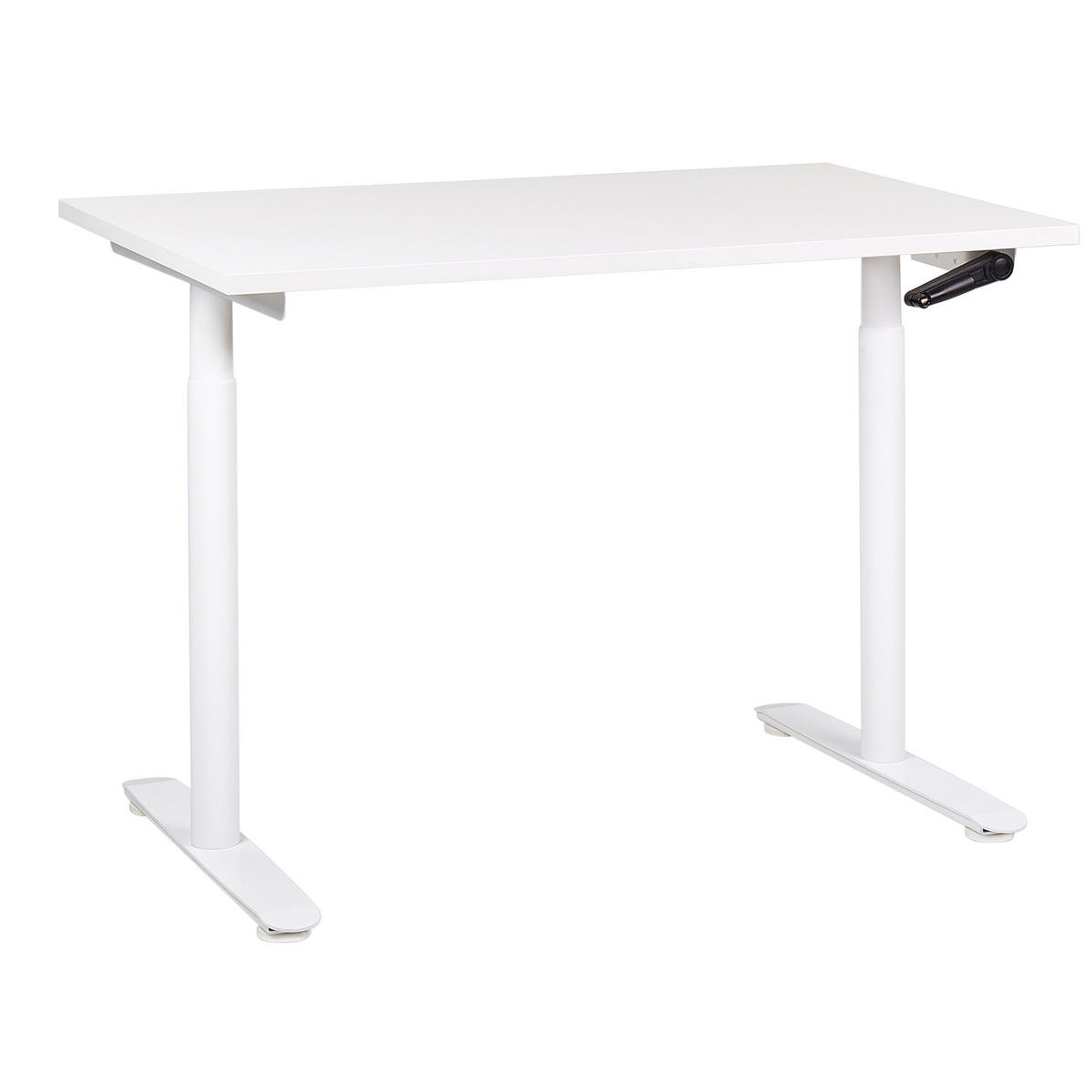 Manuell höhenverstellbarer Arbeitstisch in Weiß. Passen Sie Ihren eigenen Arbeitsplatz ganz nach Ihren individuellen Bedürfnissen an. Mit einem manuell höhenverstellbaren Tischgestell mit teleskopischen, runden Tischbeinen aus weißem, pulverbeschichtetem Stahl können Sie Ihren Arbeitsplatz im Handumdrehen ergonomisch gestalten. Dadurch haben Sie die Möglichkeit, sitzende und stehende Tätigkeiten angenehm ab zu wechseln. Mit einem Kurbelmechanismus verwandeln Sie in nur wenigen Sekunden Ihren Bürotisch in einen praktischen Stehtisch. Die robuste, weiße Tischplatte verfügt über eine strapazierfähige, nahezu kratzfeste Melaminbeschichtung.